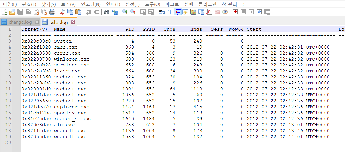 이는 노트패드++에서 볼 수 있다. 아래 사진의 내용은 프로세스들의 리스트이다.