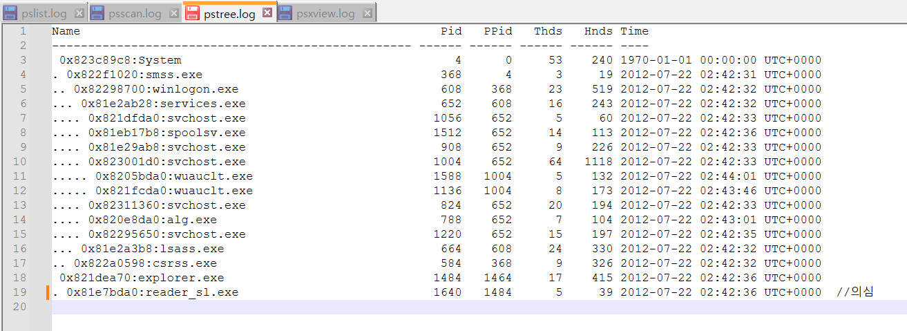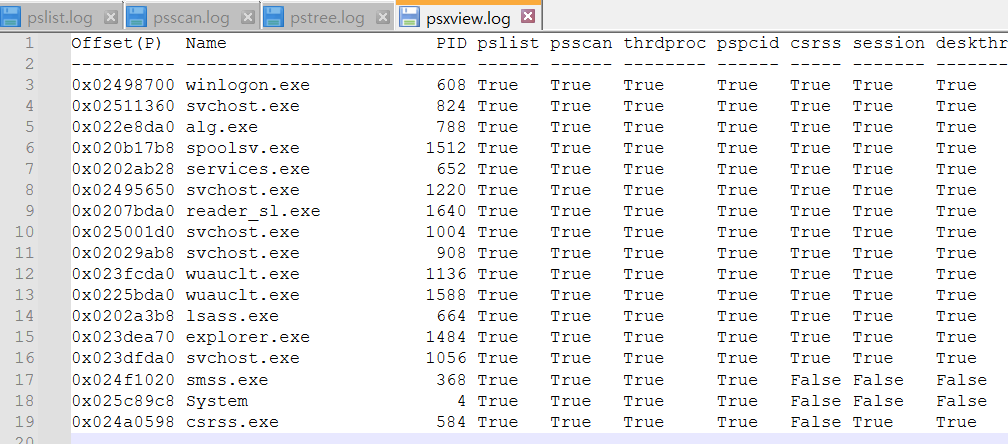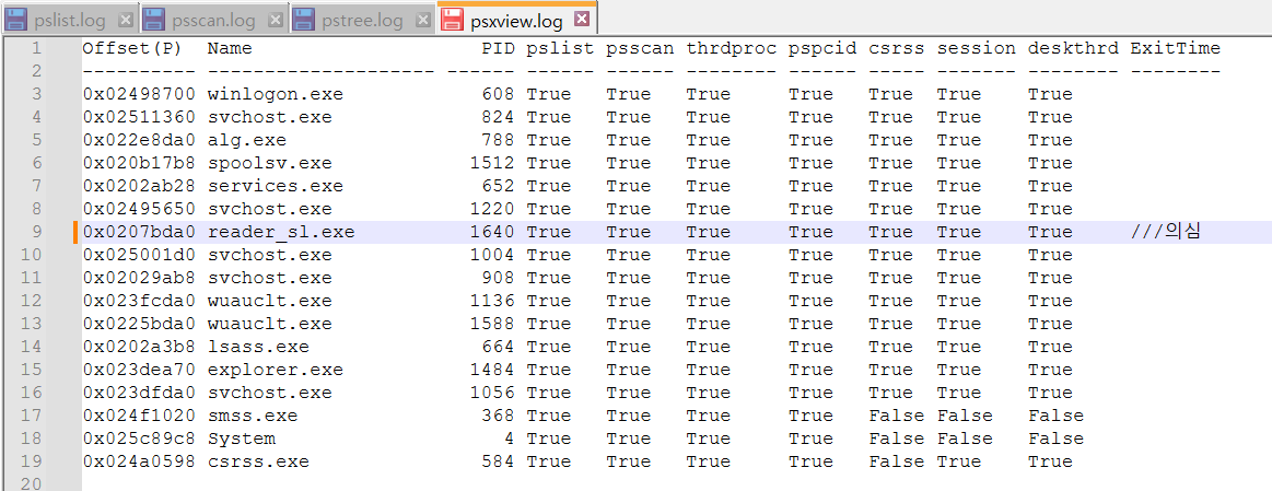 - psxview: pslist, psscan을 포함한 도구들의 결과를 한 눈에 볼 수 있음