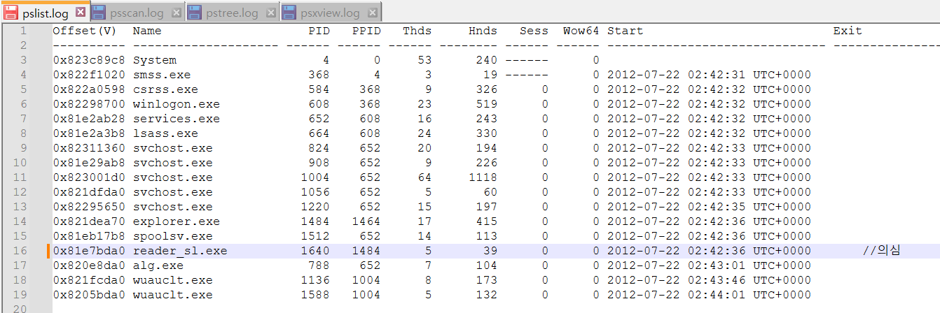 - - 악성 프로세스 "reader_sl.exe"(PID:1640) 식별