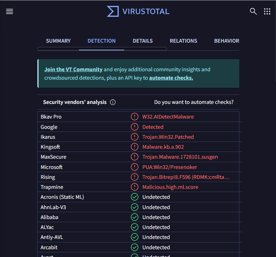 - - 프로세스 덤프 후 Virustotal 검색 결과 -> 악성 프로세스 확인