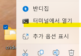 폴더를 마우스 오른쪽으로 누르고 터미널에서 열기를 하면 더 쉽게 들어갈 수 있다.
