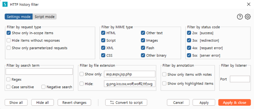 - 스크립트 인젝션이 발생할 수 있기 때문에 필터 설정
