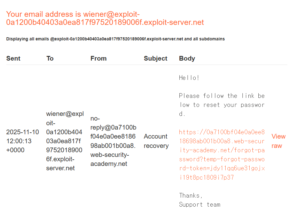 Forgot password에 wiener을 보내면 두번째 사진처럼 뜬다. 그리고 Email client 버튼을 누른다.