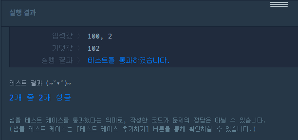 설명 #2 : num1이 100이고 num2가 2이므로 100 + 2 = 102를 return합니다.