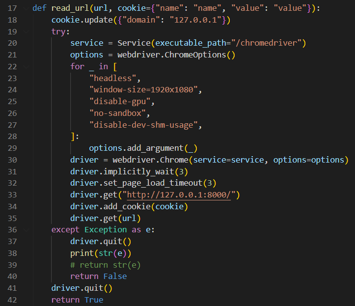 read_url 함수에서 cookie에 "domain" : "127.0.0.1" 이라는 쿠키값이 설정되는 것을 볼 수 있다.