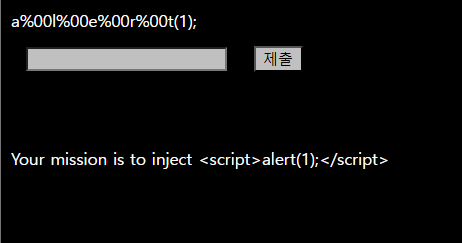 아래 입력되어 있는 것을 보니 <script> alert(1); </script>를 띄어쓰기를 이용해 실행한다면 될 것 같다. url encording에 해당하는 공백 문자는 %00이기에 글 사이사이에 %00를 넣어주면 될 것 같다.