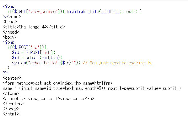 위 코드를 보니 먼저 id의 길이가 5라는 것을 알 수 있고 ls를 사용하라는 것을 볼 수 있다. ls 명령어를 사용하게 만들기 위해 "echo 'hello! ';'ls'" 여기서 세미콜론(;)은 리눅스에서 다중 명령어를 실행가능하게 해준다. 따라서 ';'ls를 아래 사진과 같이 입력해준다.